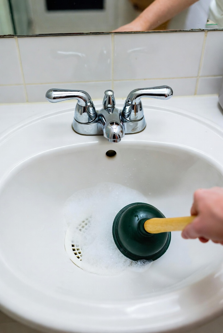 Fill the sink with a few inches of water first, then place the plunger over the drain and pump it firmly 10–15 times. The pressure and suction can dislodge blockages further down the pipe that the other methods couldn’t reach.